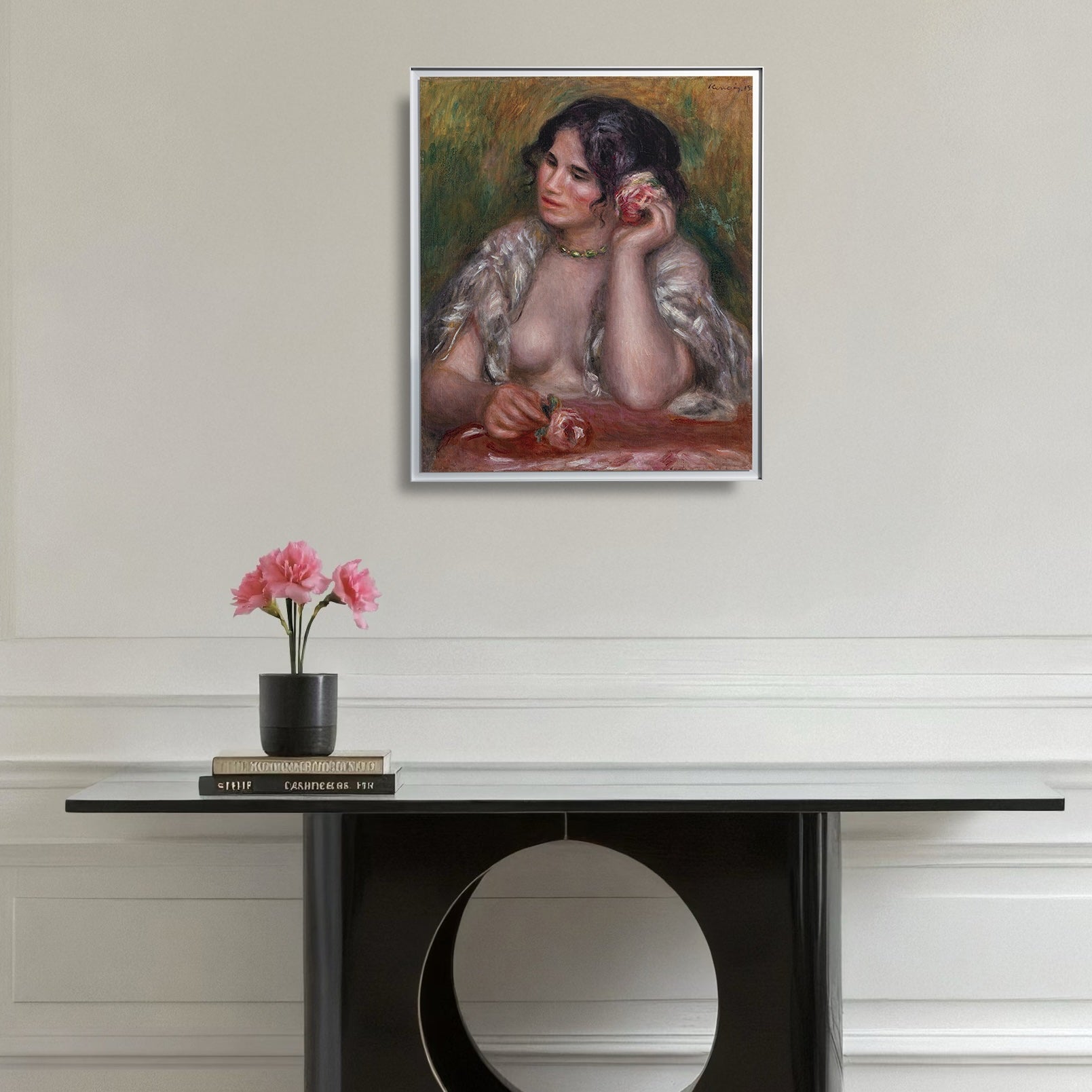 Painted around 1911, Gabrielle à la Rose is one of Renoir’s most intimate and luminous portraits of Gabrielle Renard, his beloved model and a central figure in his late work. The warm palette, delicate textures, and soft radiance of the skin exemplify Renoir’s mature style, filled with sensuality and gentle harmony.